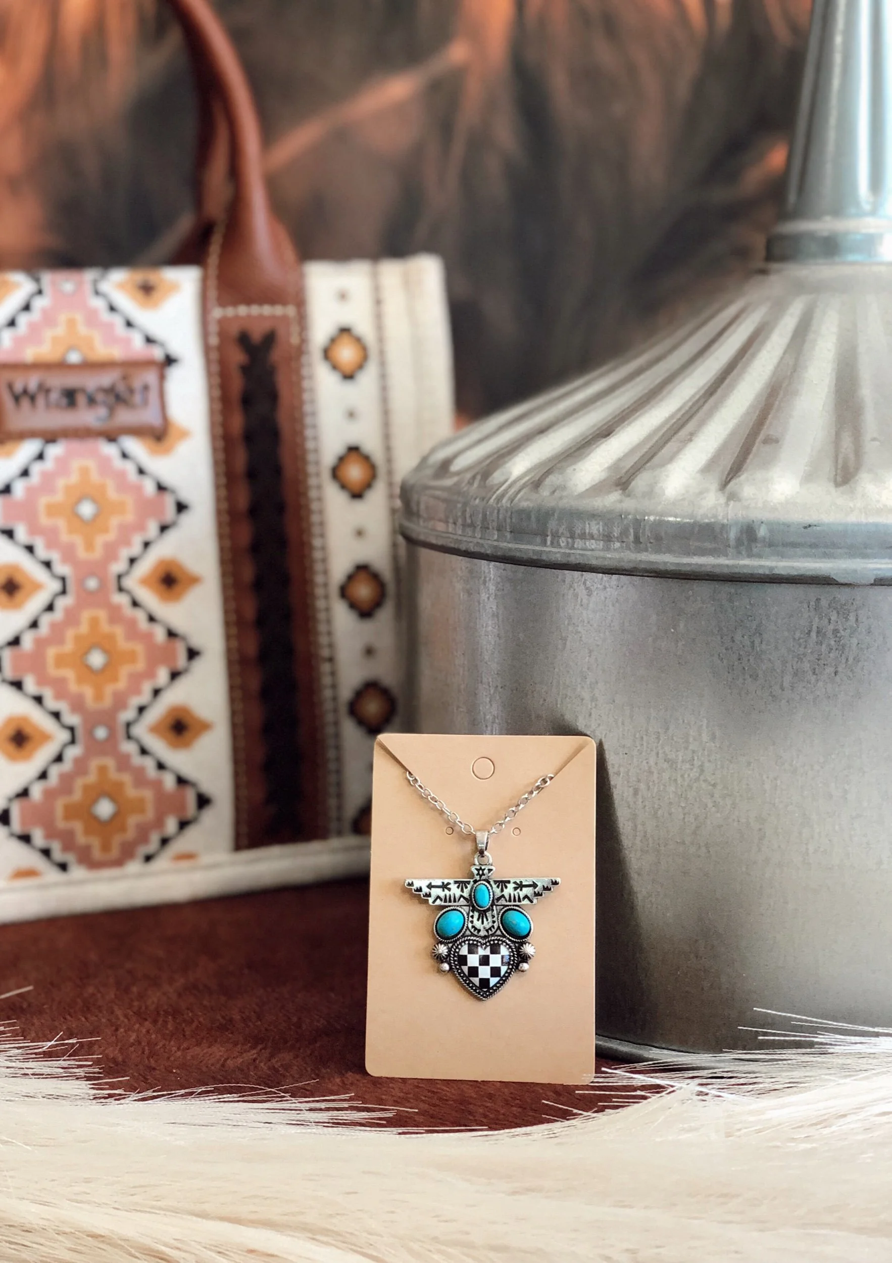 Shop › Indigenous eagle necklace Image 1 of 1 Indigenous eagle necklace $15.00 Quantity: Add To Cart Added! You Might Also Like Quick View Turquoise Beaded Necklace $10.00 Quick View Brown & White Horse Necklace $13.00 Quick View Western Charm Cowboy Boot Earrings $12.00 Quick View Cowprint Ear Tag Earrings $10.00 Quick View Aztec Necklace $15.00